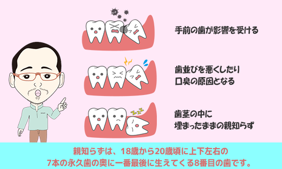 また、歯ブラシの届きにくい場所に生えるため、汚れがたまりやすく虫歯や歯肉炎を起こすケースが高まります。